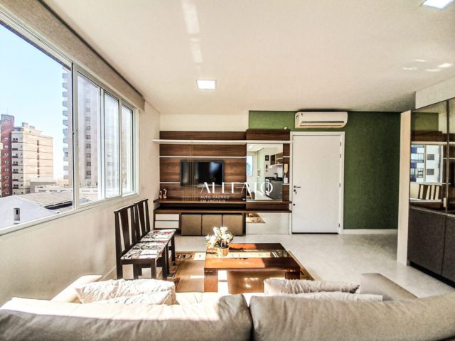 No Imóvel conta com 02 dormitórios (01 suíte), ar condicionado em todos os cômodos, 01 banheiro social, 02 camas de casal, 01 cama de solteiro e 01 cama auxiliar, área de serviço com máquina de lavar, cozinha totalmente equipada, churrasqueira, living amplo (sala de estar e jantar), janelas grandes com vista para o centro e mar, vaga de garagem fechada.