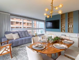 A planta conta com uma ampla sacada, ideal para relaxar e aproveitar a vista, e uma lavanderia separada, otimizando o espaço e garantindo maior funcionalidade para o dia a dia.