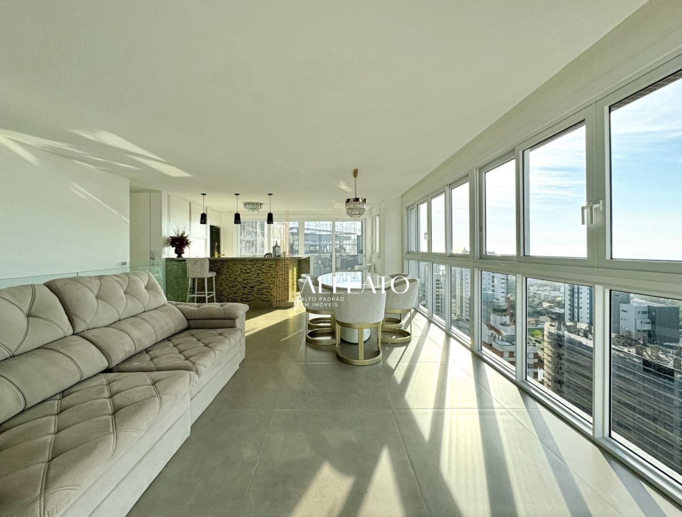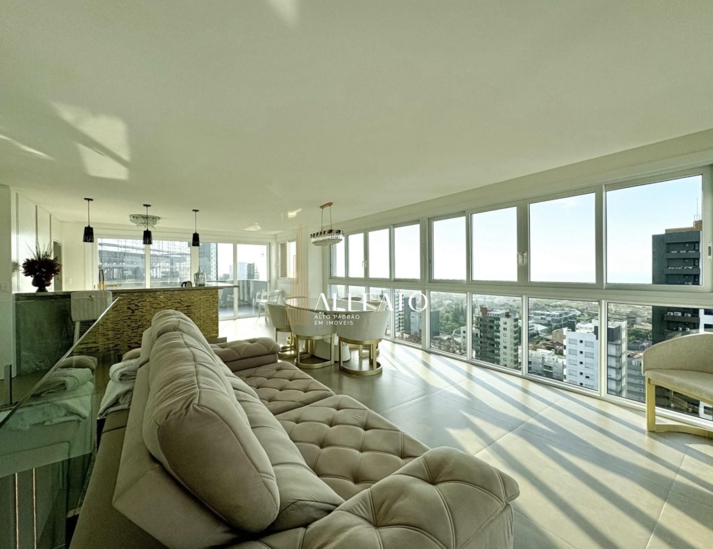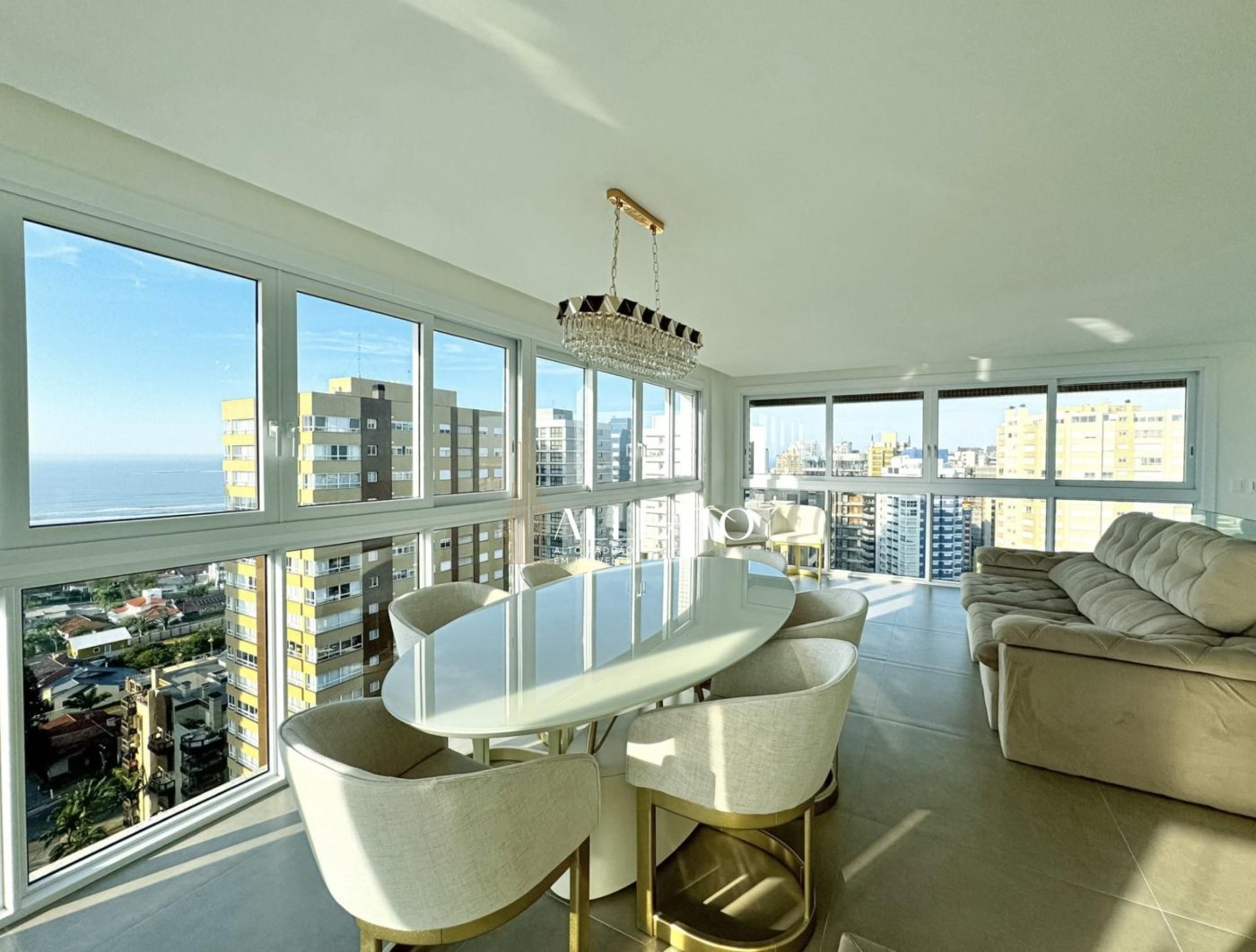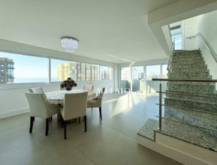 Cobertura duplex com 270m² privativos, contemplando todas as posições solares. O imóvel possui 3 suítes, 5 banheiros, espaço gourmet, sacada aberta com pé-direito duplo, terraço e duas vagas individuais de garagem no térreo. Semi-mobiliado, oferece também vista para o mar e exclusividade de uma unidade por andar.