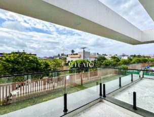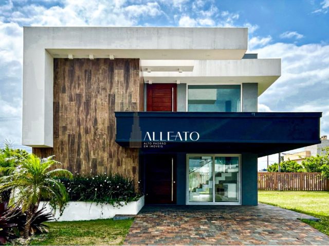 A casa conta com 294,37m² privativos, distribuídos em um sobrado amplo e moderno, composto por cinco suítes, sendo uma delas no térreo, ideal para mais praticidade no dia a dia. O living integrado com lareira e churrasqueira oferece um ambiente acolhedor e perfeito para receber bem.