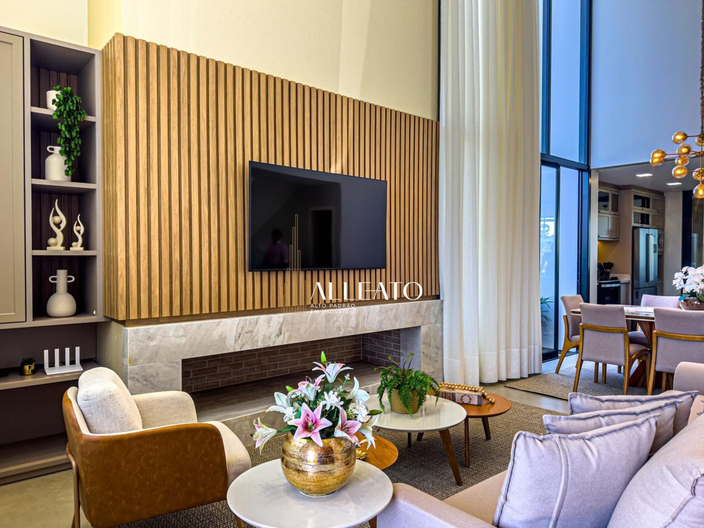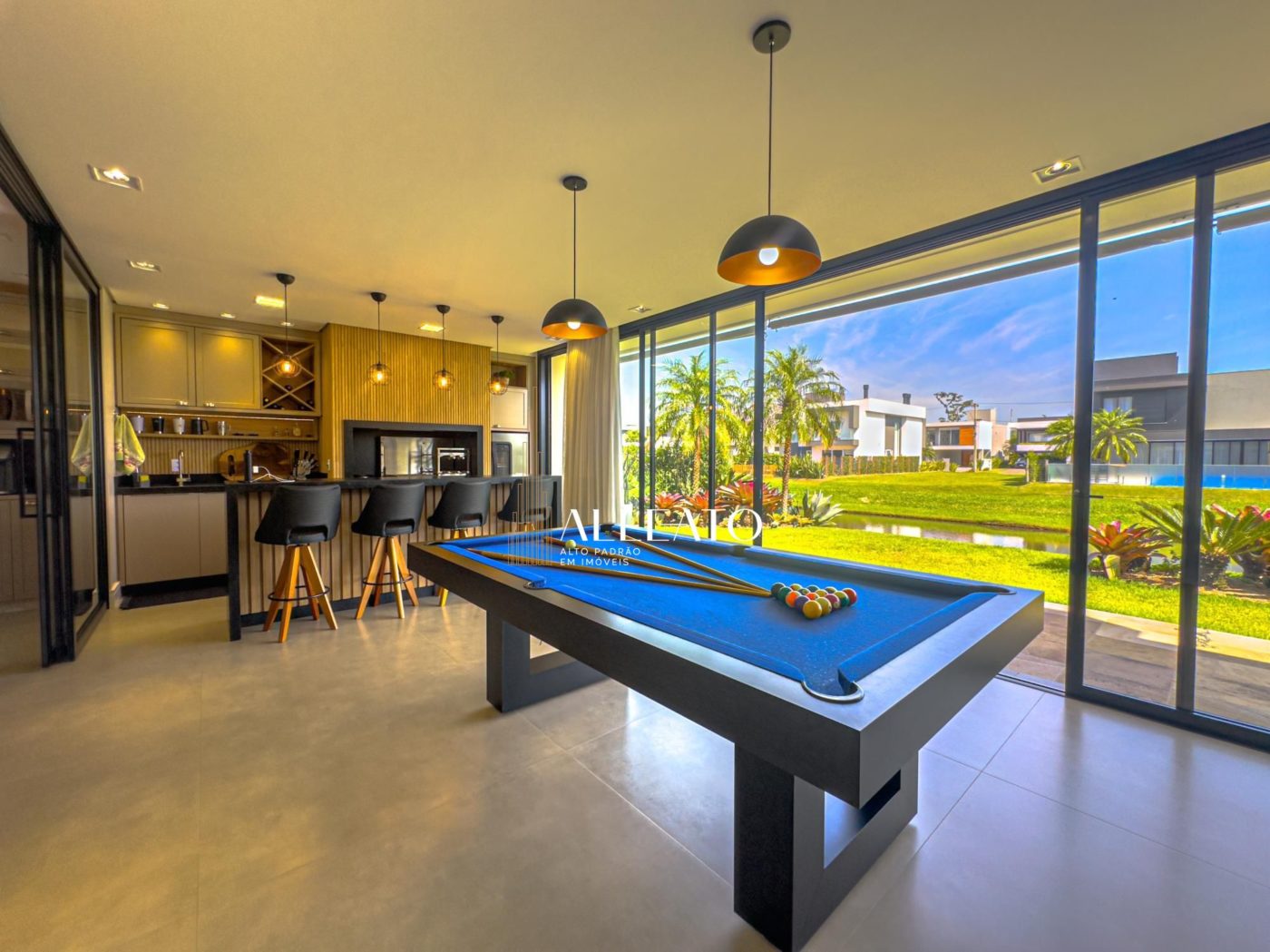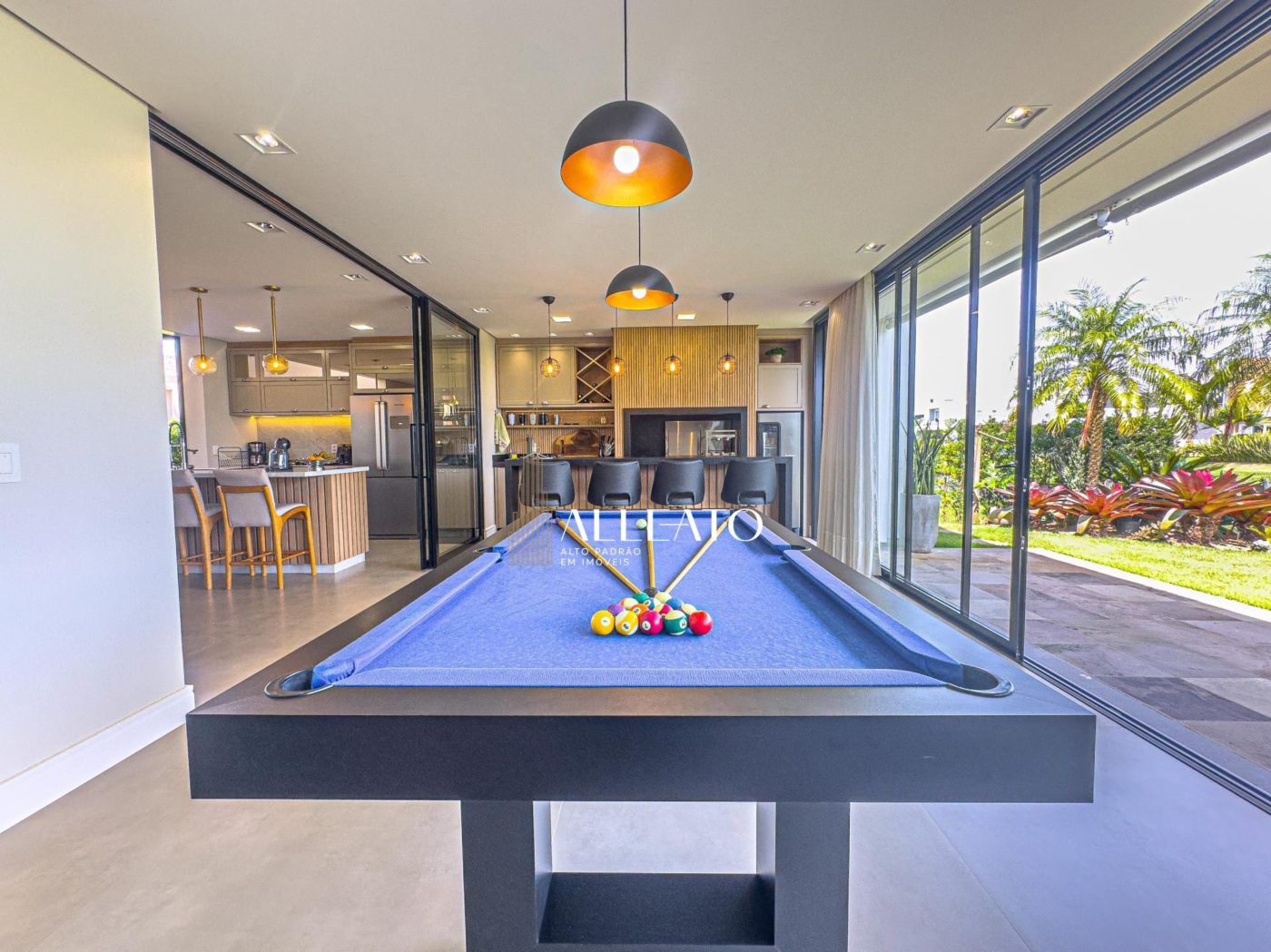 No pavimento térreo, um living imponente integra a sala de estar com lareira, a sala de jantar e a cozinha, todos espaços finamente decorados e equipados. Além disso, um espaço gourmet completo, com churrasqueira e mesa de sinuca, torna-se o local ideal para momentos de lazer e entretenimento.