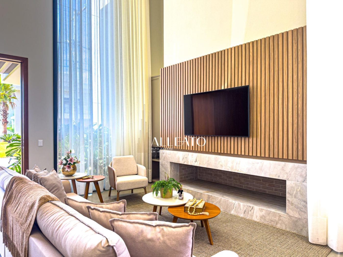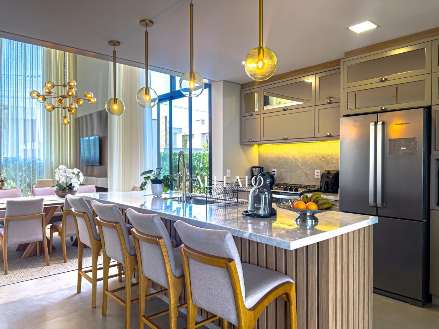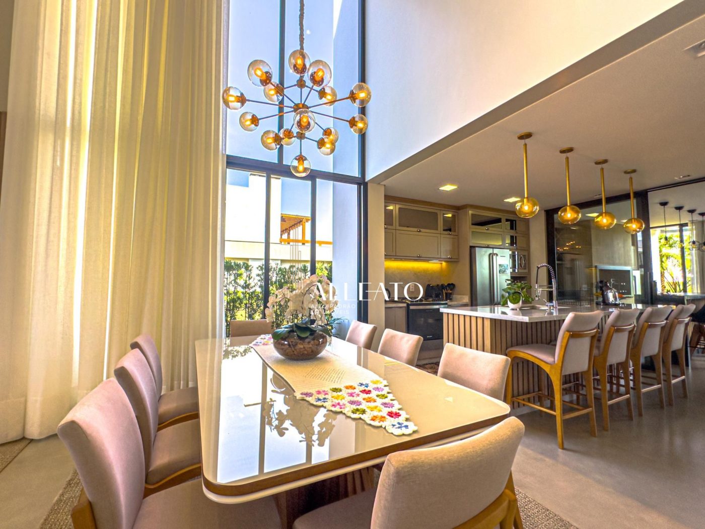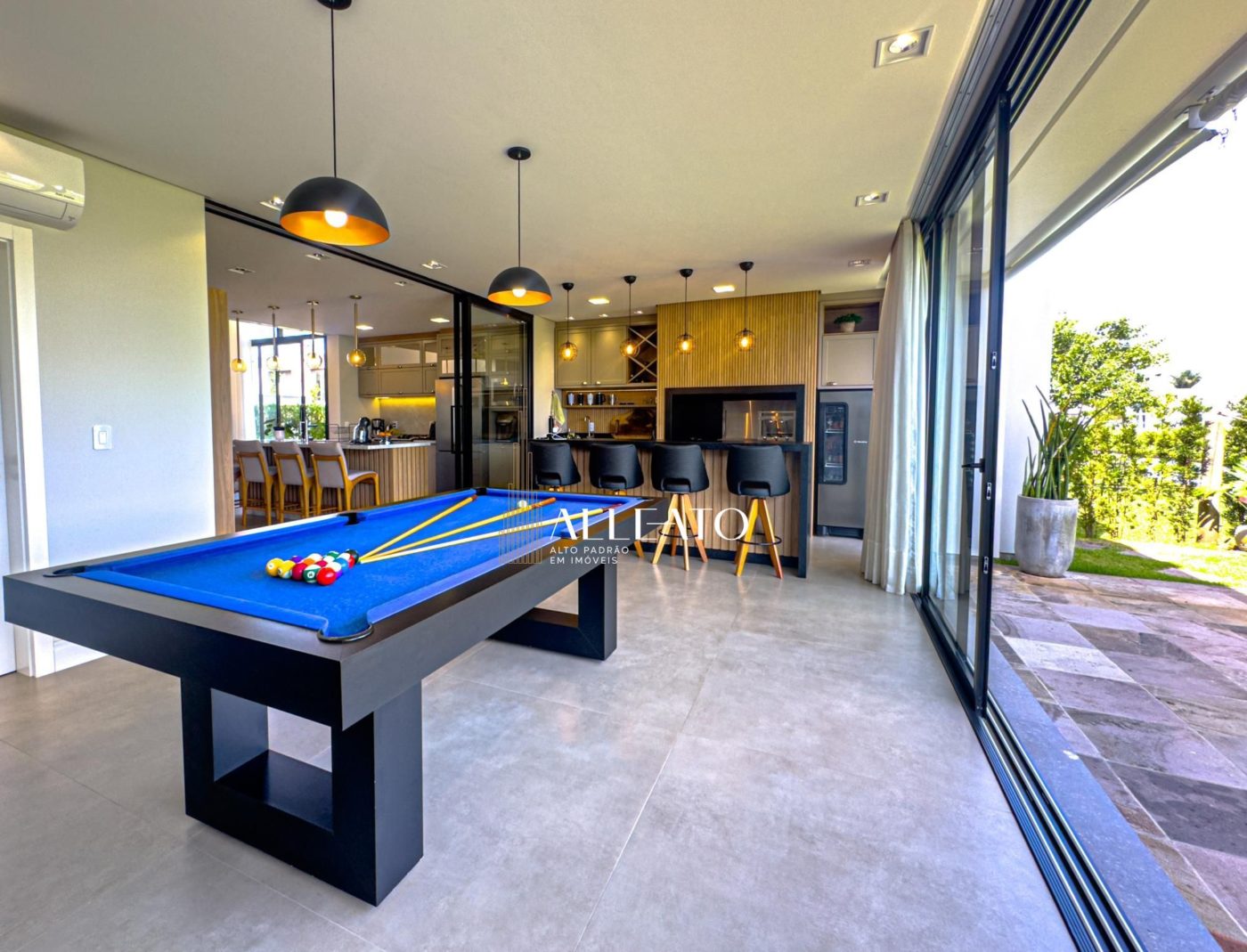 No pavimento térreo, um living imponente integra a sala de estar com lareira, a sala de jantar e a cozinha, todos espaços finamente decorados e equipados. Além disso, um espaço gourmet completo, com churrasqueira e mesa de sinuca, torna-se o local ideal para momentos de lazer e entretenimento.